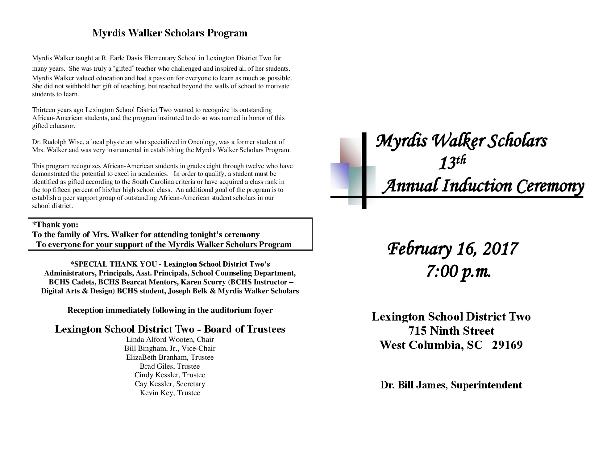 The Myrdis Walker program recognizes African-American students in grades eight through twelve who have demonstrated the potential to excel in academics.