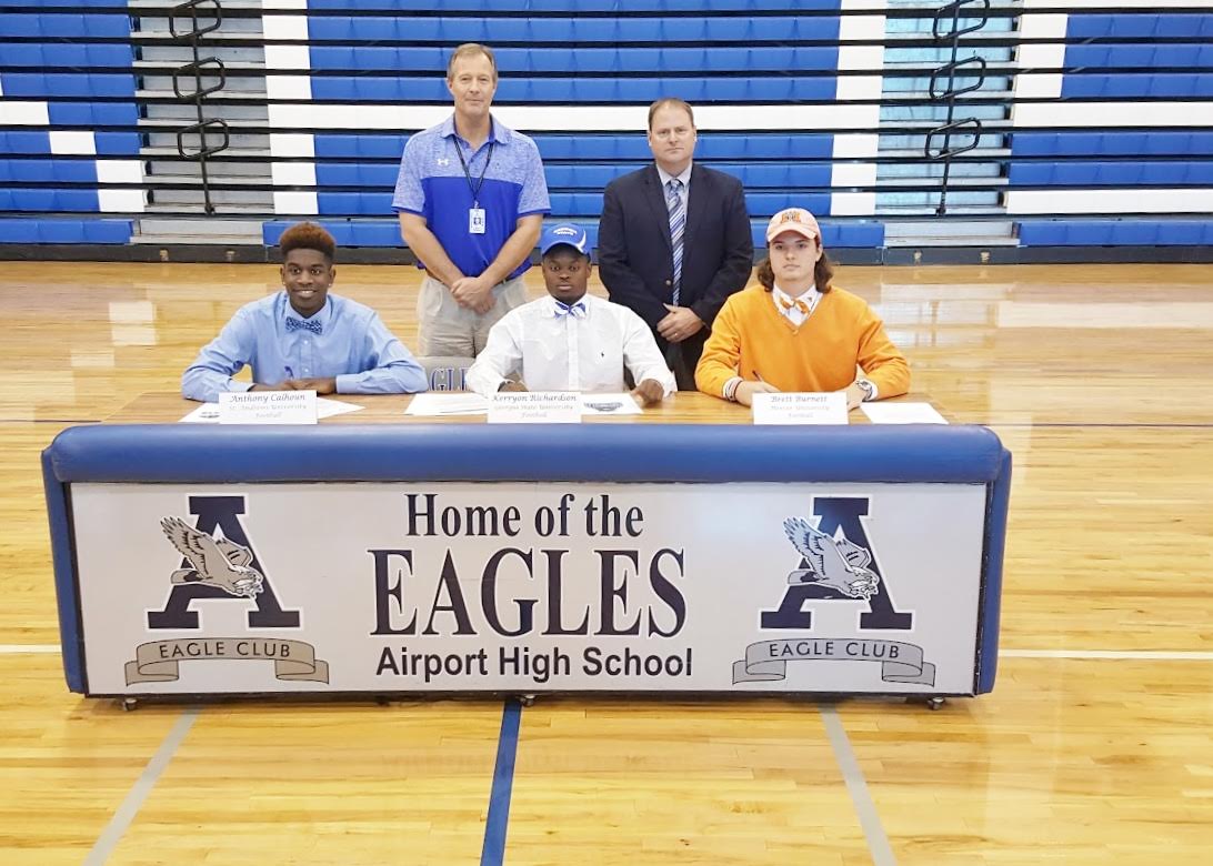 Signing to play college football from Airport High School are: Anthony Calhoun, St. Andrews University; Kerryon Richardson, Georgia State University; and Brett Burnett, Mercer. They are pictured with AHS Head Football Coach Kirk Burnett and AHS Principal Brad Coleman.