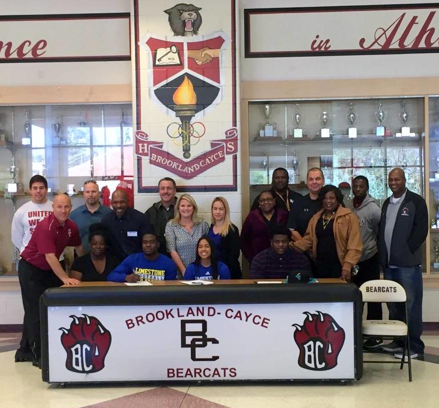 Brookland-Cayce High School signees are: Tay Pringle, football, Coastal Carolina University; Cheer Team, Selena Riley, Limestone; Cam Brown, football, Limestone. Also pictured are parents with Tay are: Lisa Pringle, Lamar Ray (stepdad) and Robin Pringle (grandmother.) Pictured with Selena are: Michelle Riley and Cheer Coach Alisha Dickerson. Pictured with Cam are: Mother Tawana Brown and Dad Stacey Jamison. With coaches Head Coach Rusty Charpia; and assistants: Phillip Blacha Matt Edwards; Curtis Fields; Lamar Ray; Stacey Bell and Robert Wells. Click on photos below to enlarge.