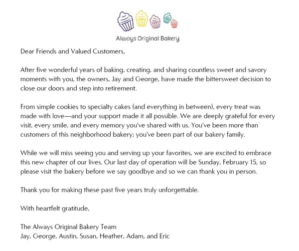 The bakery’s last day of operation will be Feb. 15, according to George. He posted a note (Below) explaining the closing on Instagram. Click here
