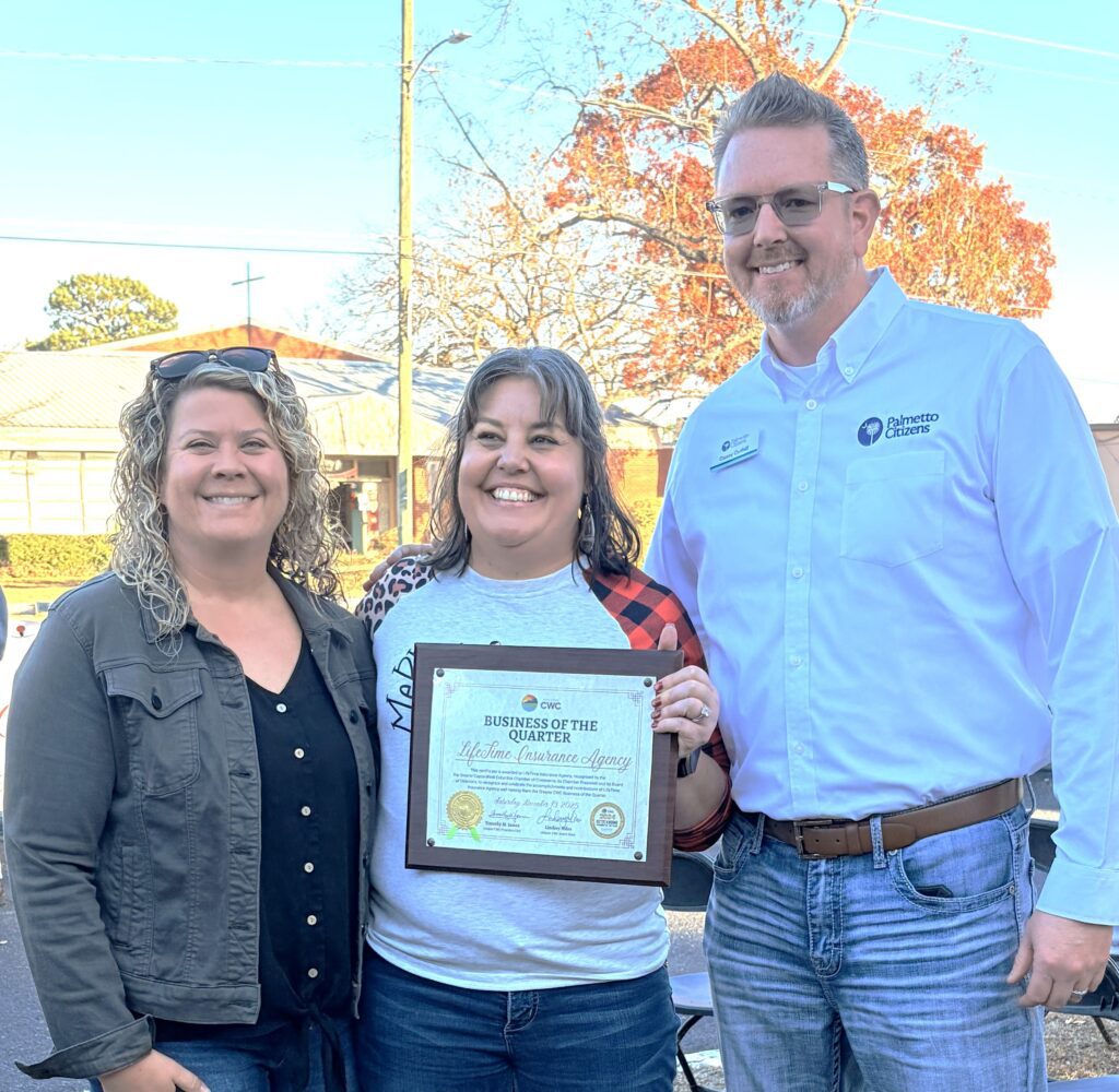 Aubrey Fitzloff, owner of LifeTime Insurance Agency at 1201 State Street in Cayce, was honored as the “Business-of-the-Quarter, Saturday, at the Cayce-West Columbia Chamber’s Parade Day celebration at the Chamber’s HQ on 12th Street.