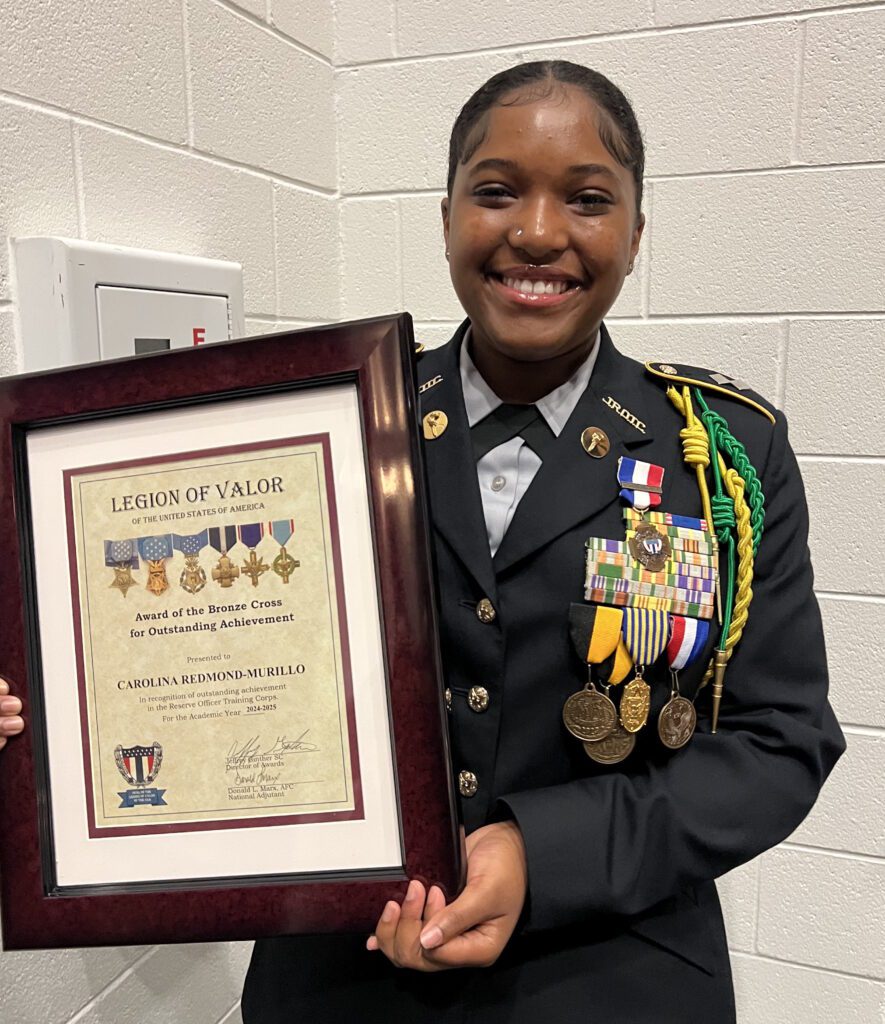 Senior Carolina Redmond-Murillo has been awarded the Legion of Valor Bronze Cross, an elite recognition that is given to outstanding high school or college Reserve Officers’ Training Corps (ROTC) and Junior ROTC cadets, recognizing exceptional achievement in military, education, leadership, and community service. The award is presented by the Legion of Valor of the United States of America, a fraternal organization for recipients of the nation’s highest honors for heroism, including the Congressional Medal of Honor and Service Crosses.