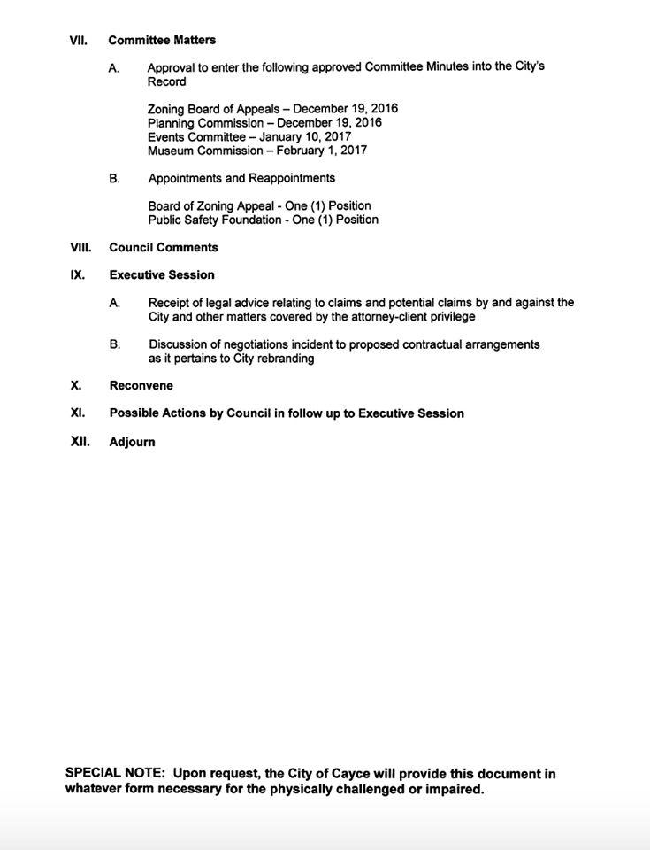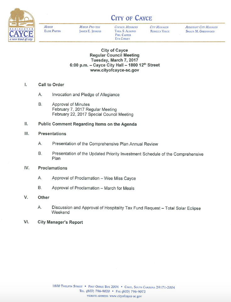 The regular Cayce City Council meeting is at 6 p.m. Tuesday. Below is a copy of the agenda.