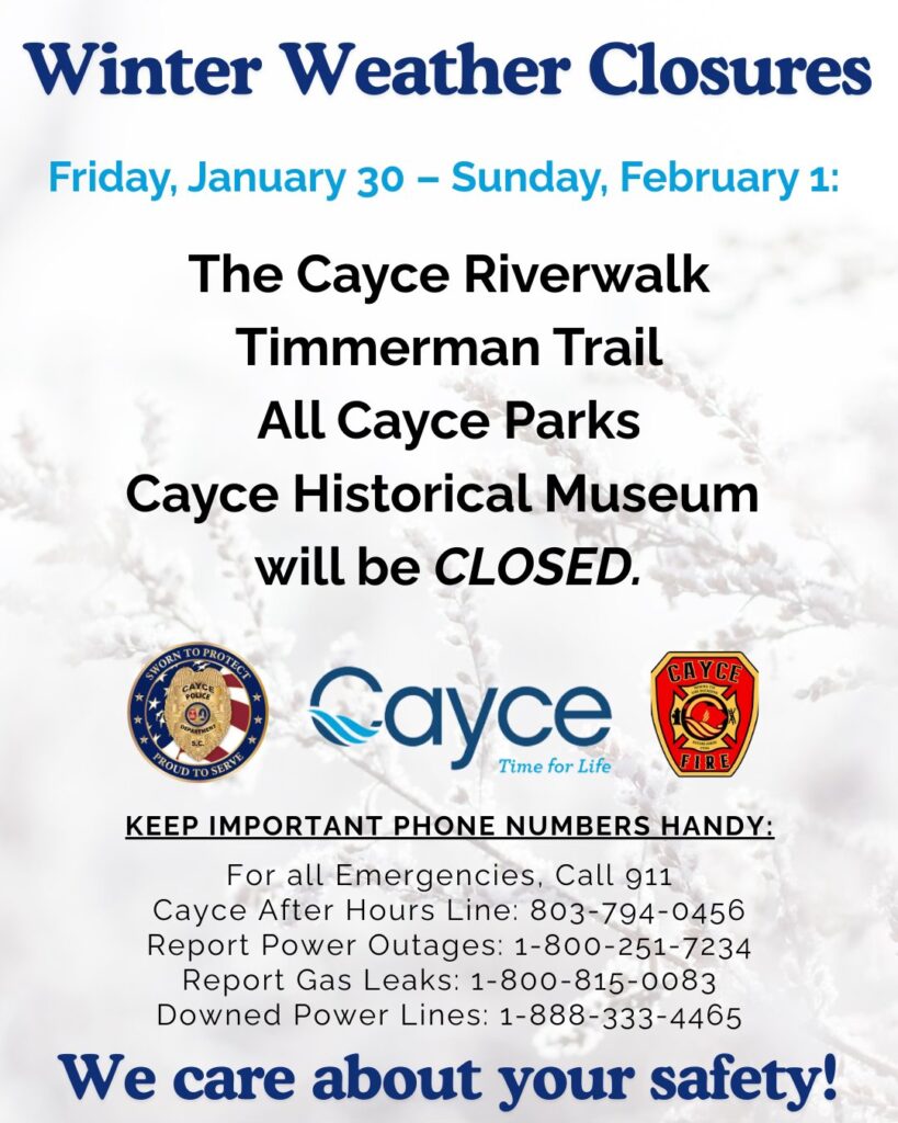 Cayce Riverwalk, City Parks Closed as winter storm approaches