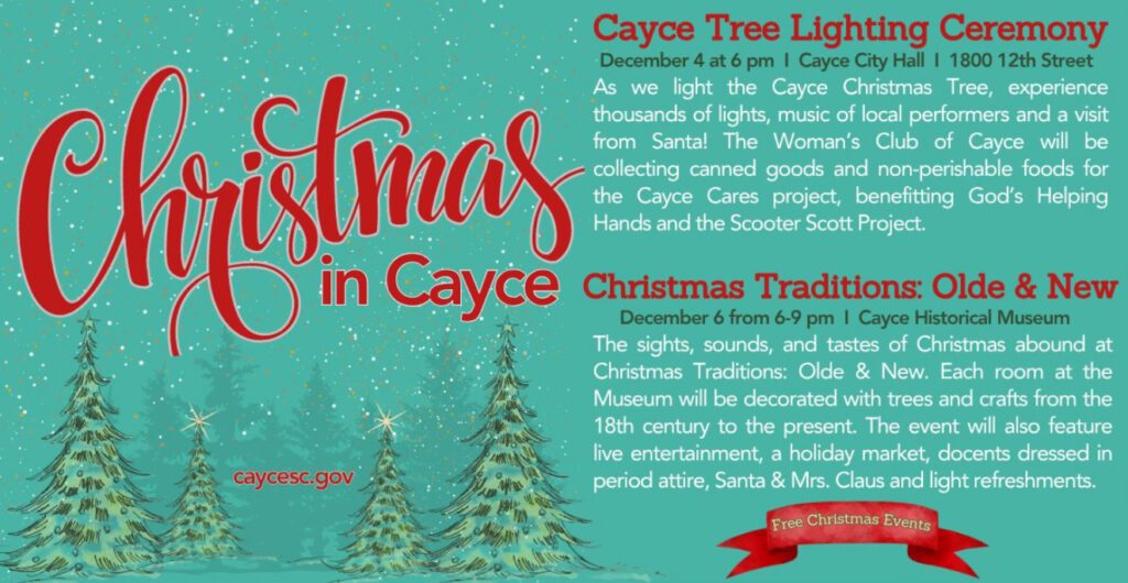 As we light the Cayce Christmas Tree, experience thousands of lights, music of local performers and a visit from Santa! The Woman’s Club of Cayce will be collecting canned goods and non-perishable foods for the Cayce Cares project, benefitting God’s Helping Hands and the Scooter Scott Project. The tree lighting will be aired live on WLTX News19 and the drive through light display will be opened form December 4 – the end of 2025.