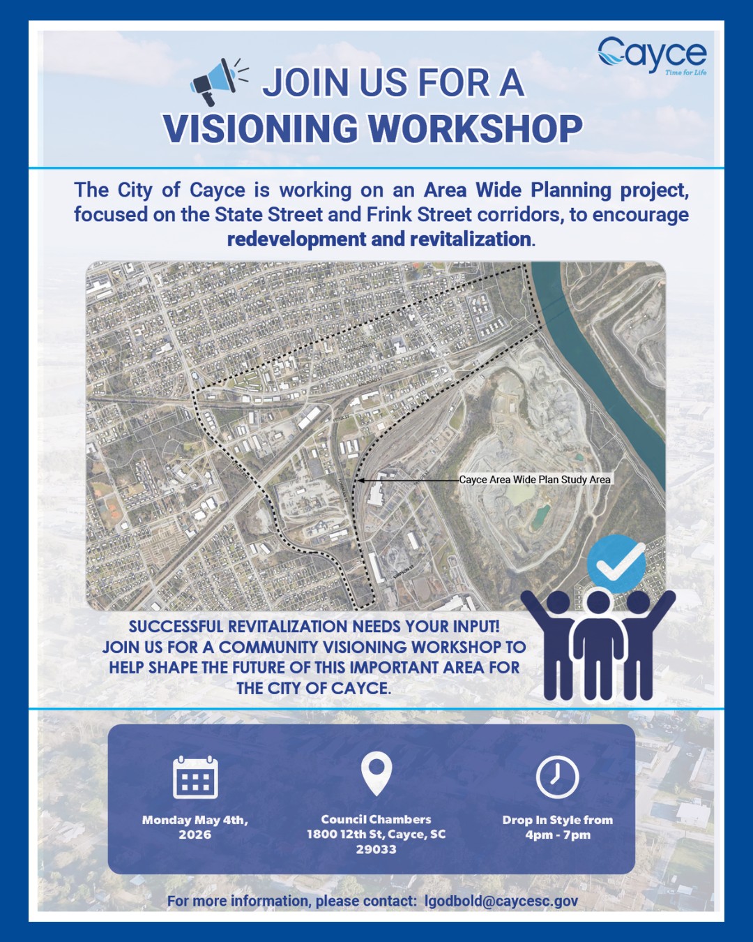 Join the City of Cayce for a community visioning workshop to help shape the future of one of Cayce’s most important areas.