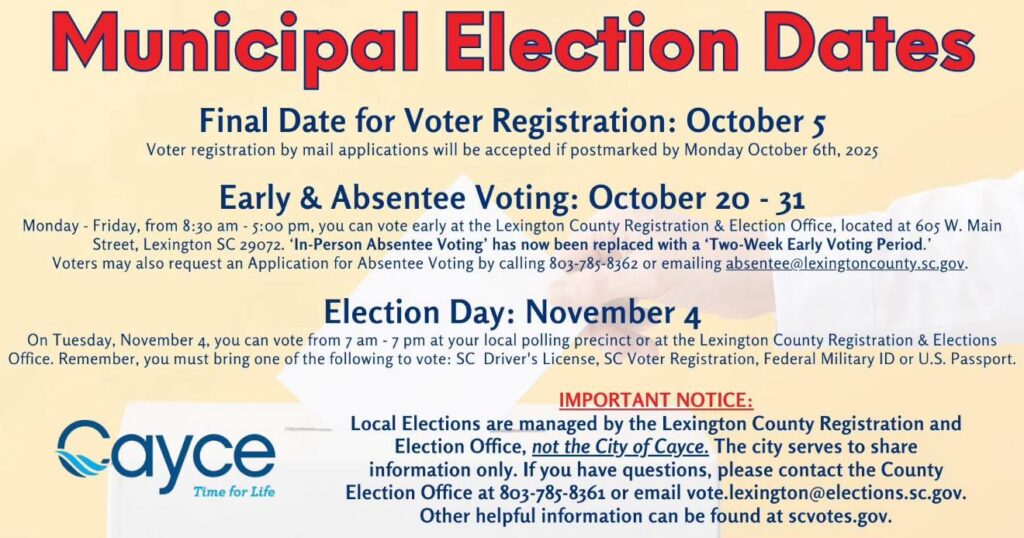 The City of Cayce is posting information regarding the the Nov. 4 Municipal Election including dates and Information. Local elections are managed by the Lexington County Registration and Election Office.