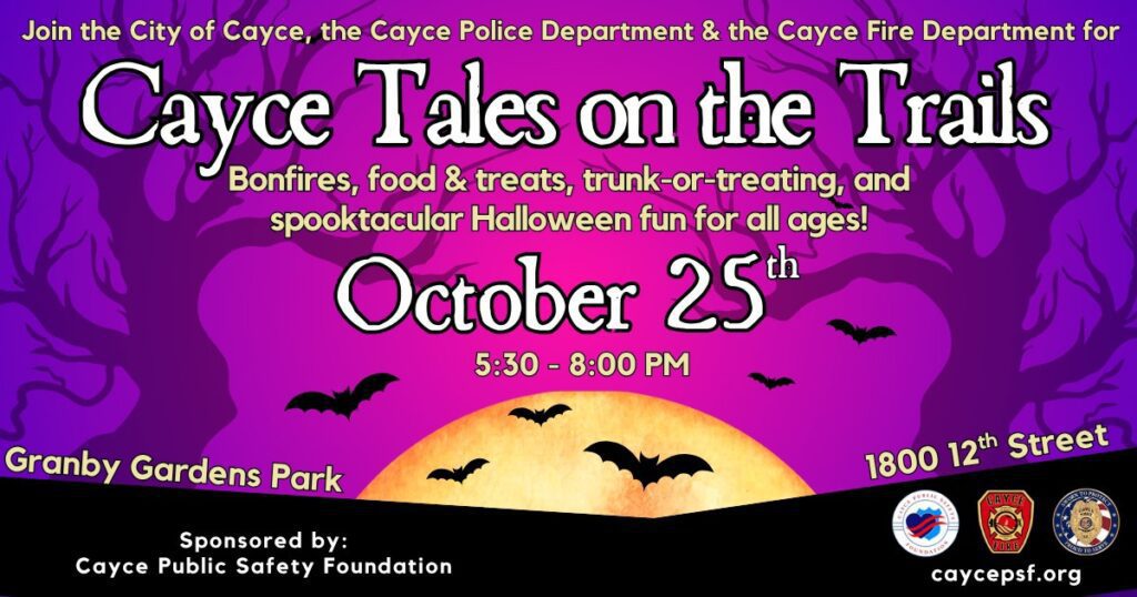 Join the City of Cayce, Cayce Fire Department and the Cayce Police Department for Cayce Tales on the Trails at Granby Gardens Park! There will be bonfires, food & treats, trunk-or-treating, and lots of spooktacular Halloween fun for all ages!