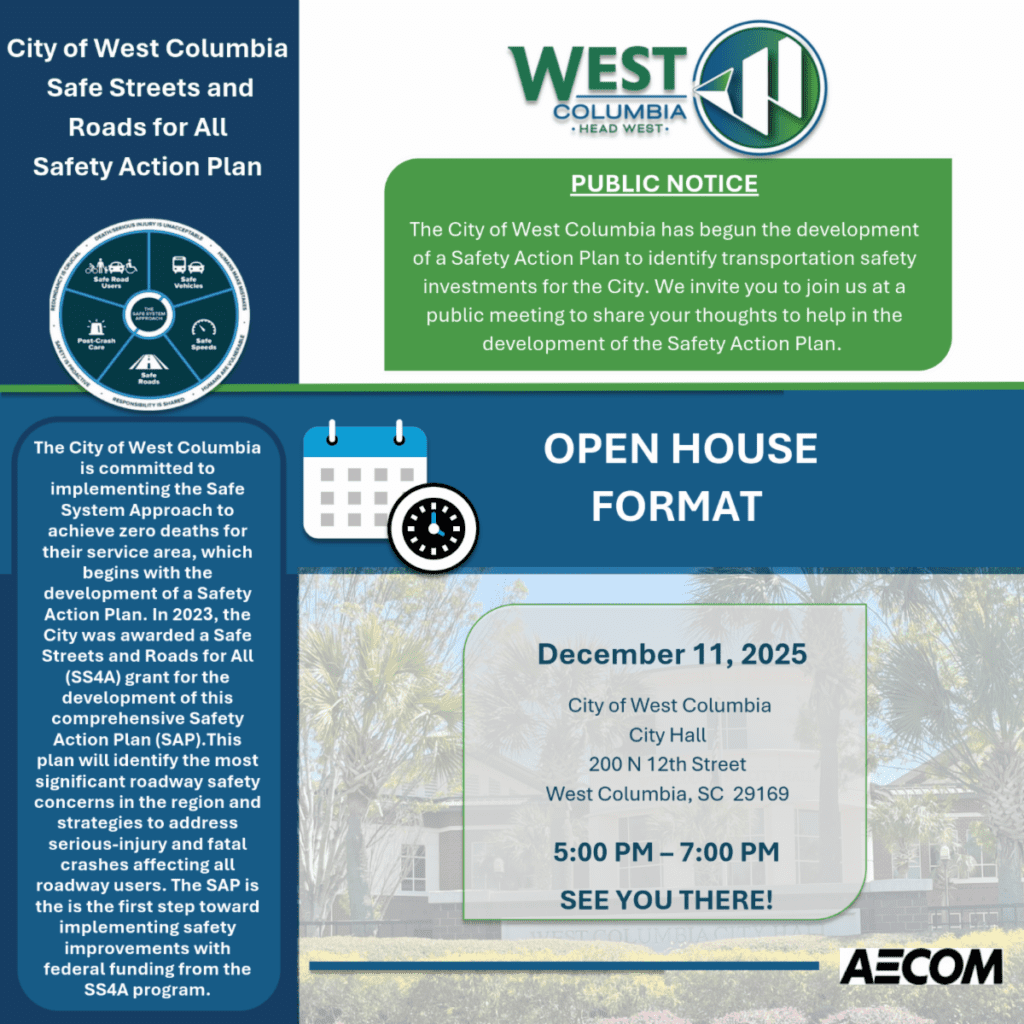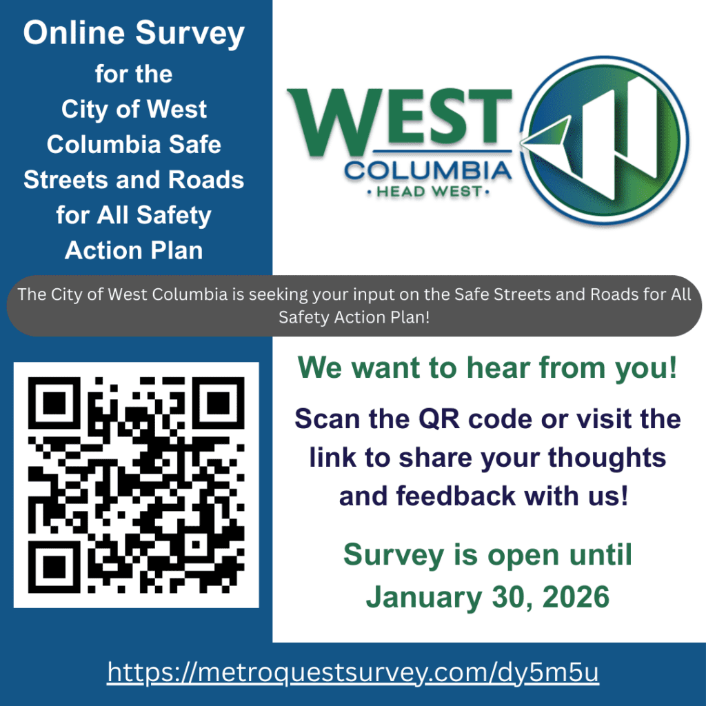 The Safety Action Plan also positions the City to pursue future federal funding opportunities for implementing the recommended improvements. Community involvement will play a central role in shaping the plan, and the City invites residents, business owners, and stakeholders to participate in upcoming public meetings and an online survey to share feedback and help guide the future of transportation safety in West Columbia.
