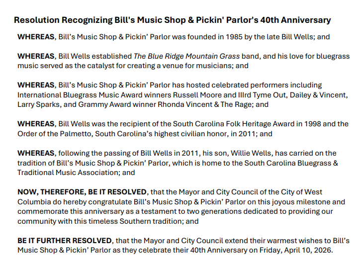 City of West Columbia presents Resolution to Bill’s Music Shop and Pickin’ Parlor on its 40th Anniversary – Celebration is Friday at Bill’s