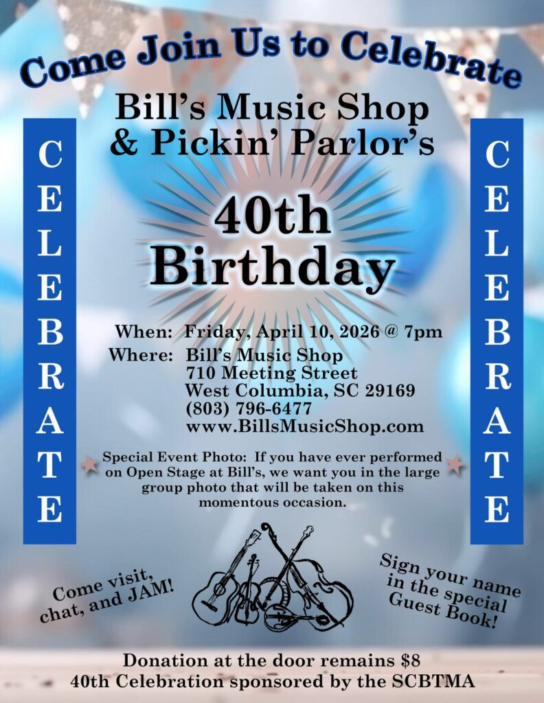 Bill opened the doors to the Pickin’ Parlor in December of 1985, and this Friday we’re celebrating 40 of bluegrass pickin’! Please make plans to stop by and celebrate. You can get on stage to perform and join a jam group. Also, there will be photos taken of everyone who’s ever played on Bill’s stage. There will be a taco bar and cake! Doors open at 6 p.m.
