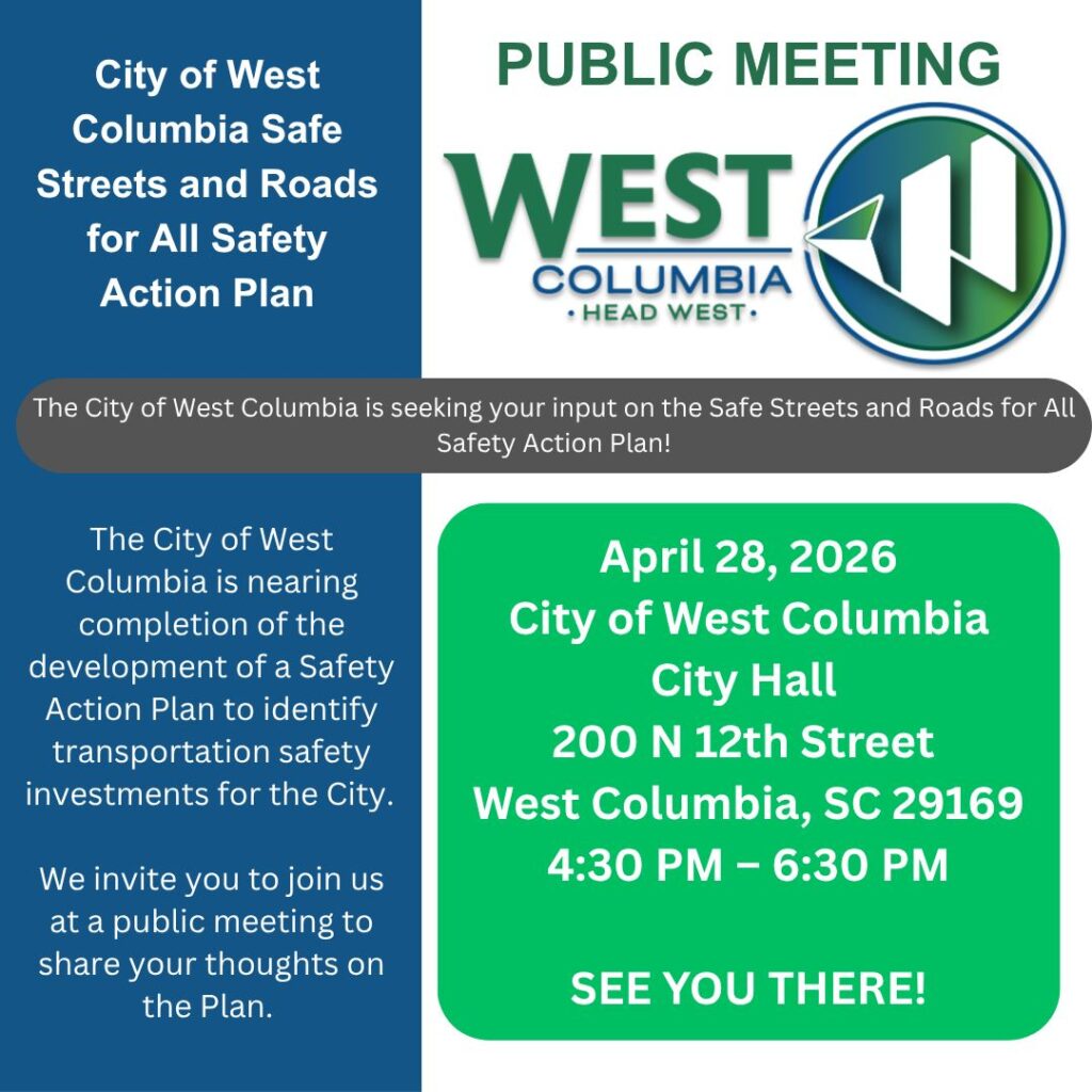 The City of West Columbia is wrapping up its Safety Action Plan development with the assistance of AECOM and invites the public to share thoughts on the Safety Action Plan (SAP) at our public meeting on Tuesday, April 28, from 4:30 to 6:30 PM at City Hall. This plan focuses on transportation, street safety improvements, and recommendations throughout the city.