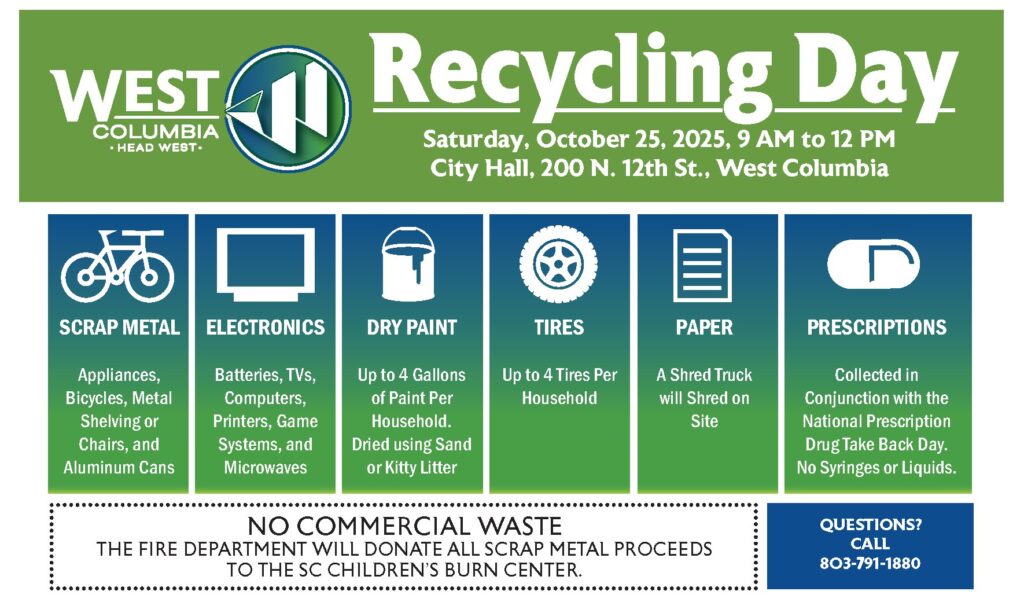 September 29, 2025||Comments Off on City of West Columbia’s Recycling Day is Saturday, Oct. 25|NEWS, Social Media