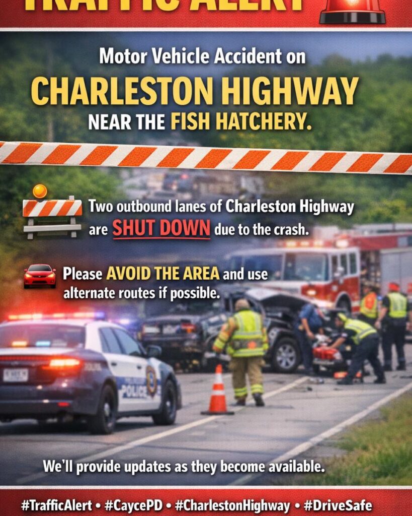 The Cayce Police Department reported that a Vehicle Accident on Charleston Highway near the Fish Hatchery Road resulted in two outbound lanes of Charleston Highway being shut down due to the crash. the wreck occurred on Monday afternoon.