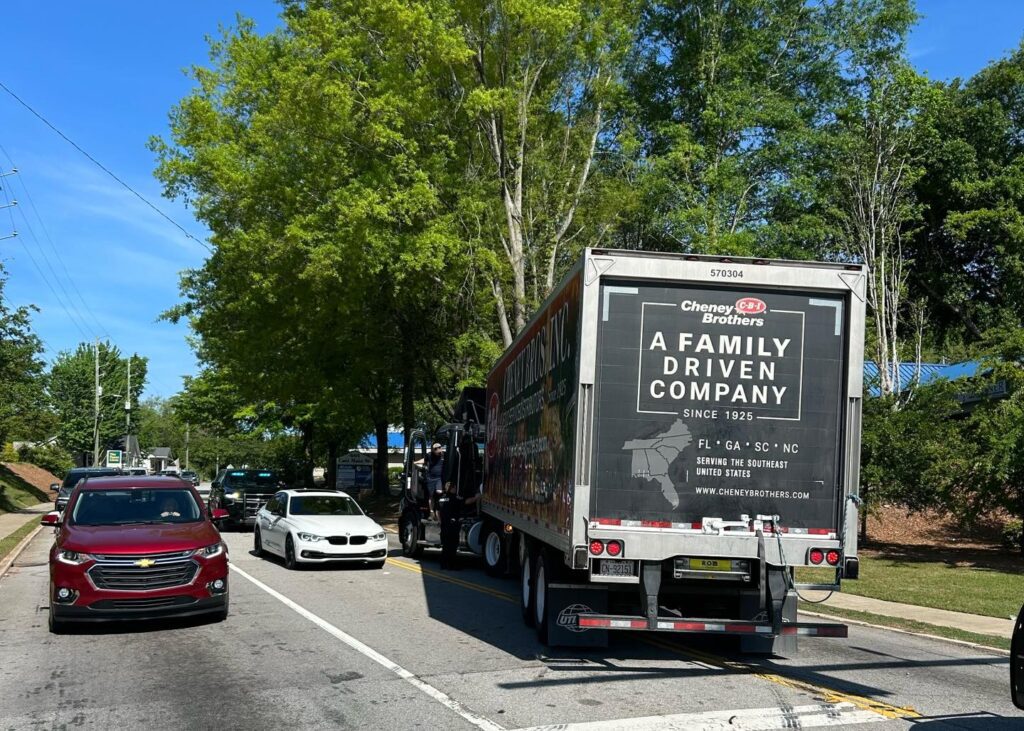 A disabled semi truck and trailer at East Main Street (US-1) and Harmon Street in Lexington resulted in inbound traffic being detoured onto Harmon Street, Tuesday. Lexington Police photo.