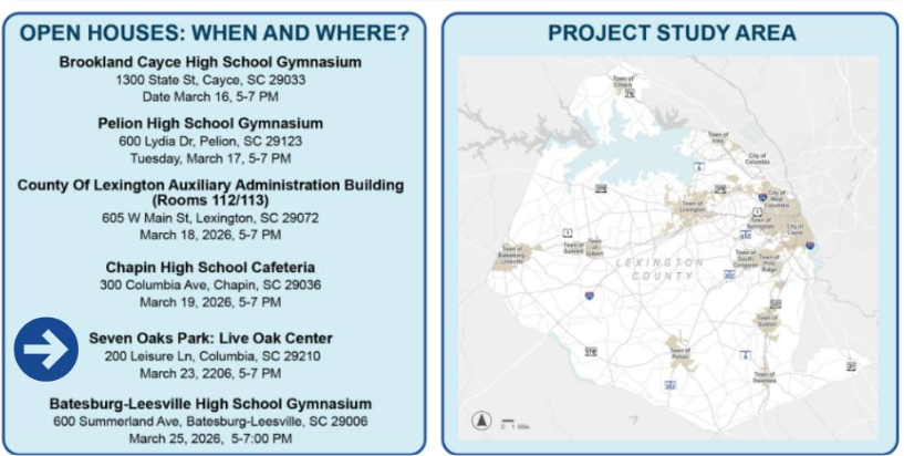 The Open House meetings provide an opportunity for residents, businesses, and stakeholders to learn about the Transportation Improvement Plan and share input on future transportation needs. Public feedback will help guide transportation priorities and investment decisions throughout Lexington County.