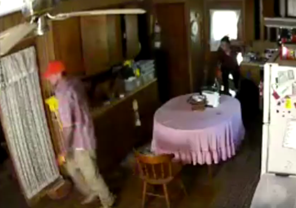 The owners said the two suspects kicked in the back door and took hunting equipment. Suspects and truck depicted in photos.