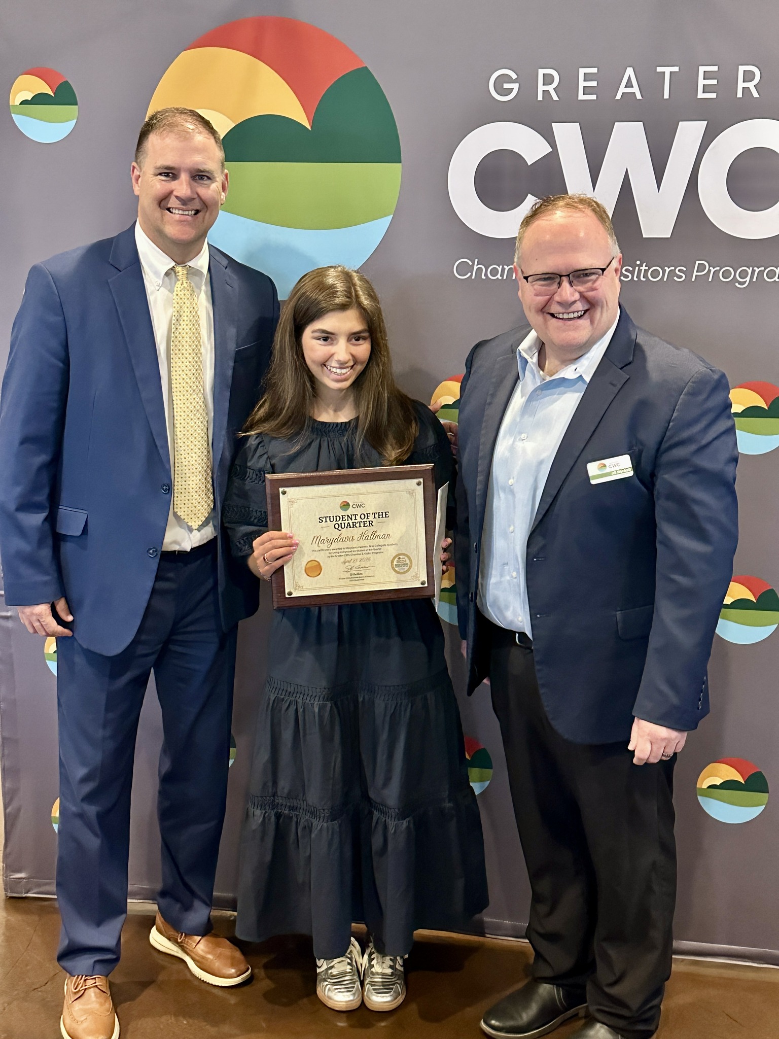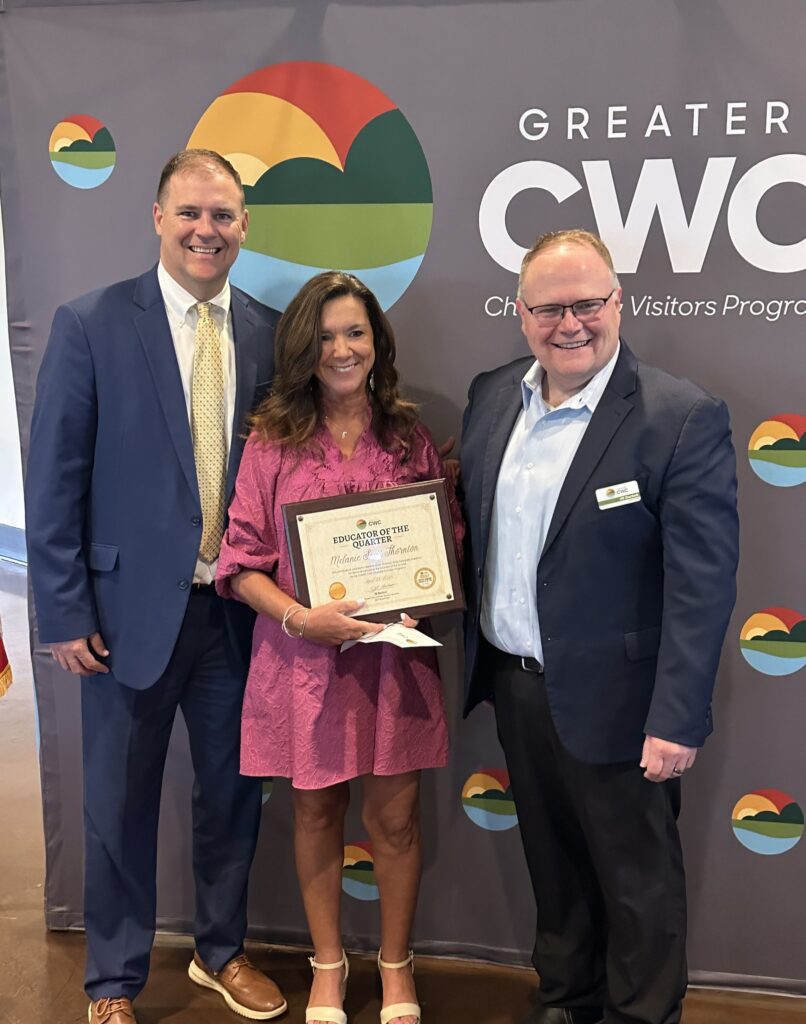 From Gray Collegiate Academy, Marydavis Hallman of was named Student-of-the-Quarter. Melanie Scott Thornton was named Educator-of-the-Quarter. The breakfast business meeting was held at Stone River in West Columbia. Also pictured JB Beckett, C-WC Chamber Board Chairman and Dr. Brian Newsome of Gray.