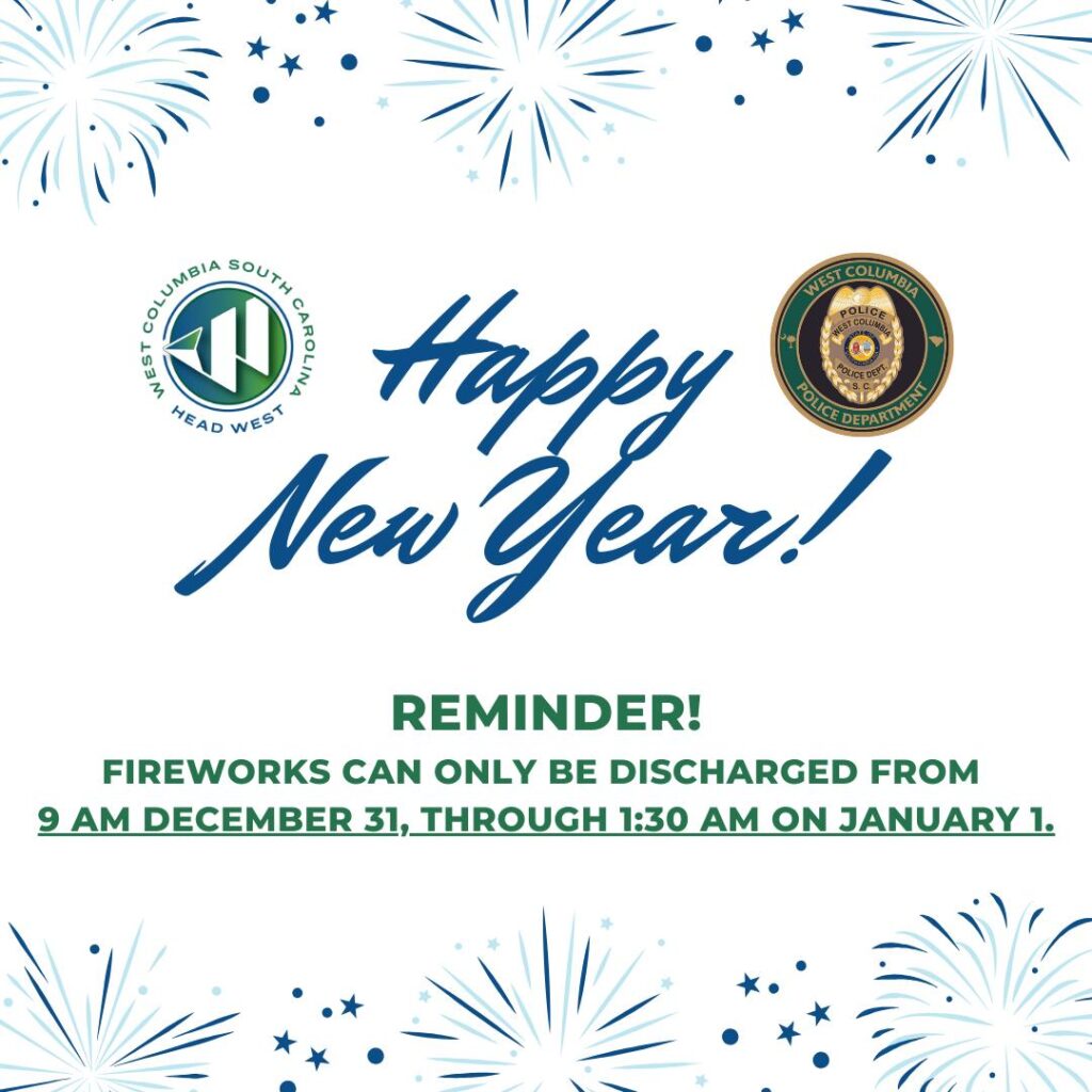 West Columbia: In the City of West Columbia Fireworks can only be discharged from 9 AM on December 31 through 1:30 AM on January 1, 2025.
