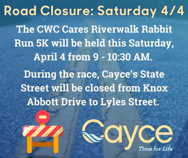 State Street will be closed, Saturday, from Knox Abbott Drive to Lyles Street from 9–10:30 a.m. for the Cayce-West Columbia Chamber’s Cares Foundation Riverwalk Rabbit Run 5K.