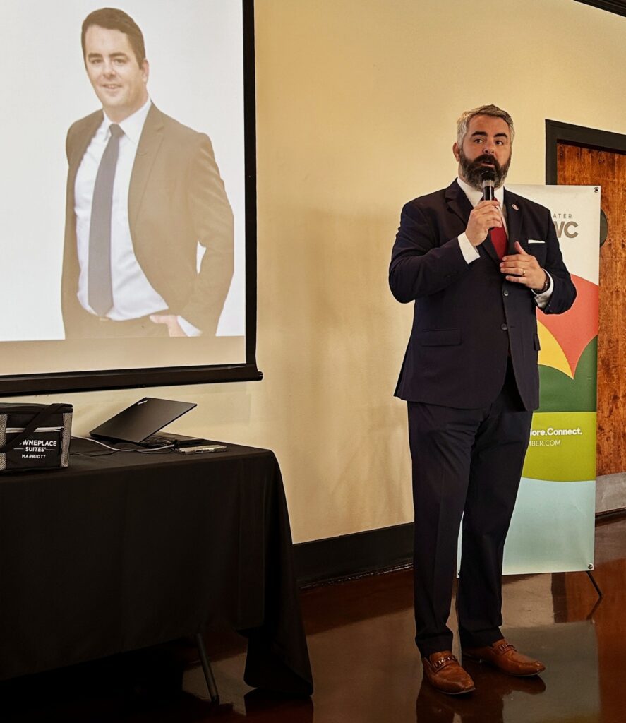 State Rep. Micah Caskey spoke at the Greater Cayce-West Columbia Chamber of Commerce Breakfast, Tuesday at Stone River, in West Columbia. It was sponsored by Kay Plumbing, Heating and Cooling. The program featured remarks from Rep. Micah Caskey and recognized Butch Wallace Insurance Agency as Small Business of the Quarter, an award sponsored by Palmetto Citizens Federal Credit Union. Emphasizing the morning’s theme of connection and community, Konrad of Kay Plumbing, Heating & Cooling shared the message, “Relationships are everything.”