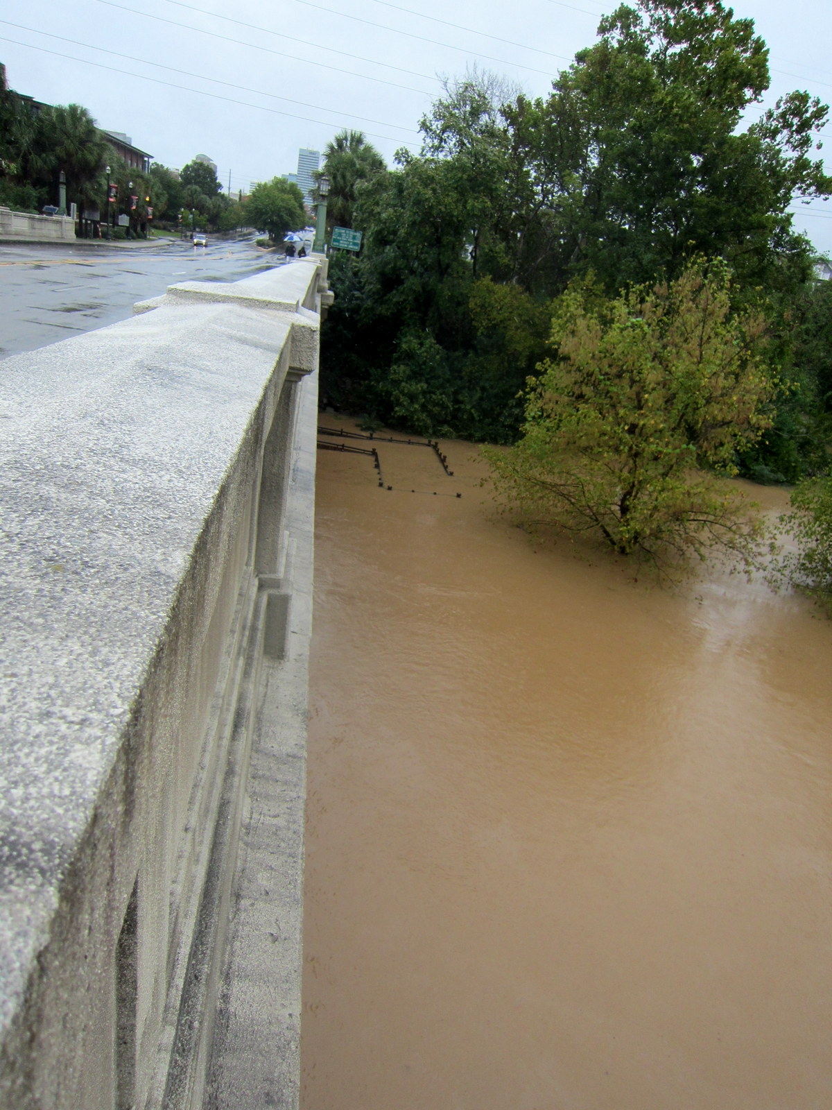 From Saturday to Sunday, as water flowed downstream, the Congaree River rose substantially. These are photos taken Saturday and then Sunday. Onlookers lined the Gervais Street Bridge Sunday to witness the historical flood and high water level.