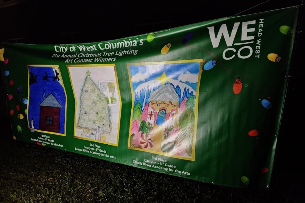 “What Christmas Means to Me” elementary school essay contest winners read their winning entries and student artwork of contest winners adorned the grounds around West Columbia City Hall.