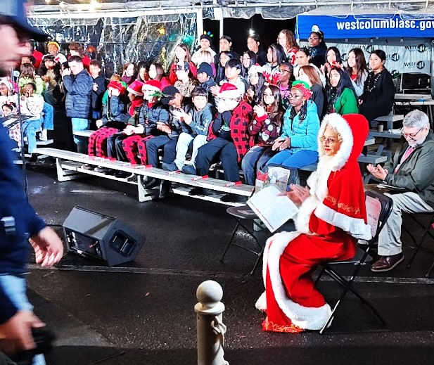 After the Christmas music, festivities and a seasonal message delivered by Welsh, the switch to light up the City’s Christmas tree was flipped with the help of West Columbia Mayor Tem Miles and the essay and art-winning kids.
