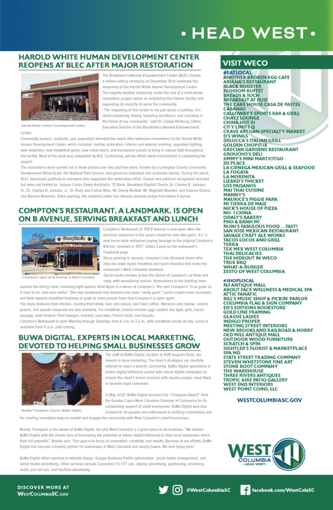 West Columbia February-March Newsletter, with Mayor, City Council updates, Brookland-Lakeview Empowerment Center, Compton’s Restaurant, and BuWa Digital. Click Here For A Link To it