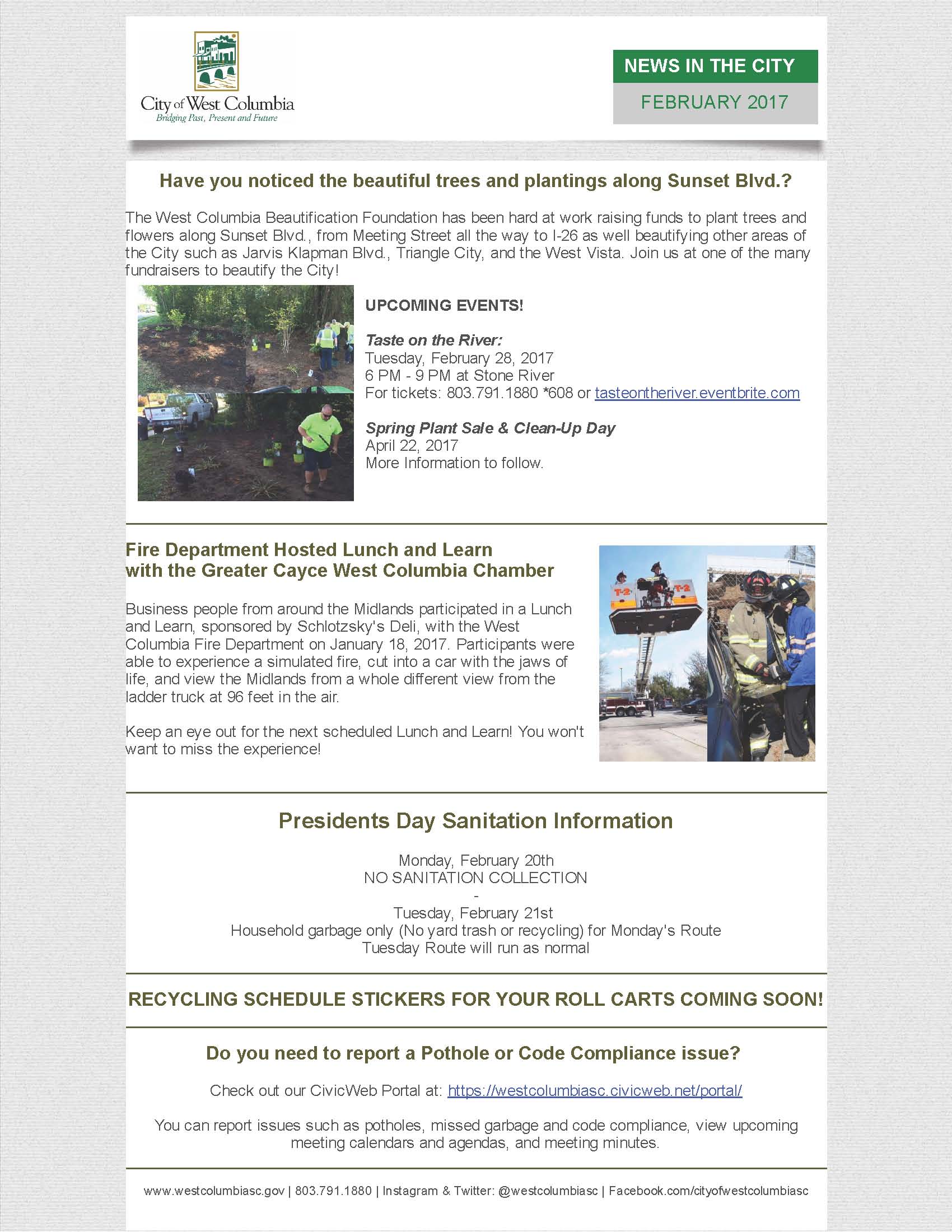 The City of West Columbia’s City News letter list important upcoming dates for city events. It also has