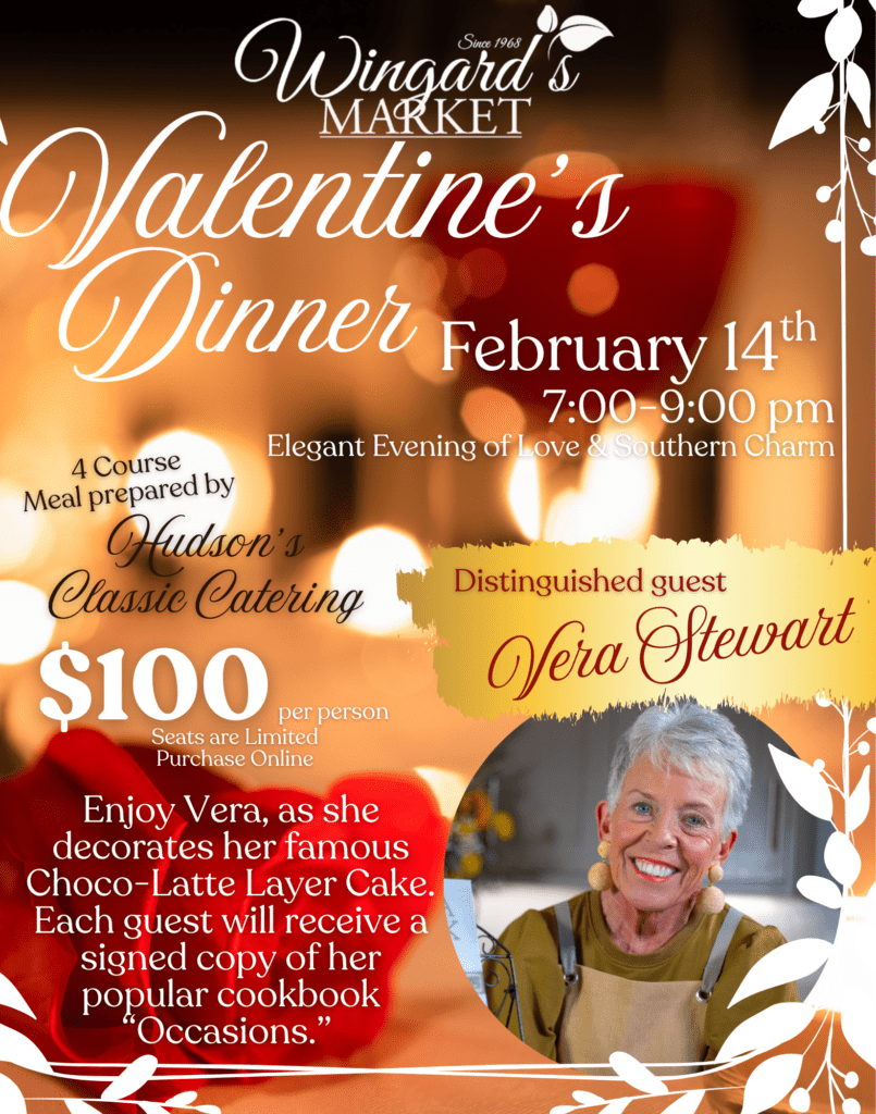 Wingard’s Market is excited to announce the details of their Valentine’s Dinner with Vera Stewart – A Local Celebration of Love, Flavor & Community – on Saturday, Feb. 14, from 7–9 p.m., with the bar opening at 6:30 p.m. This special evening invites couples, friends, and community members to celebrate Valentine’s Day with delicious, local fare and the company of renowned culinary personality Vera Stewart.