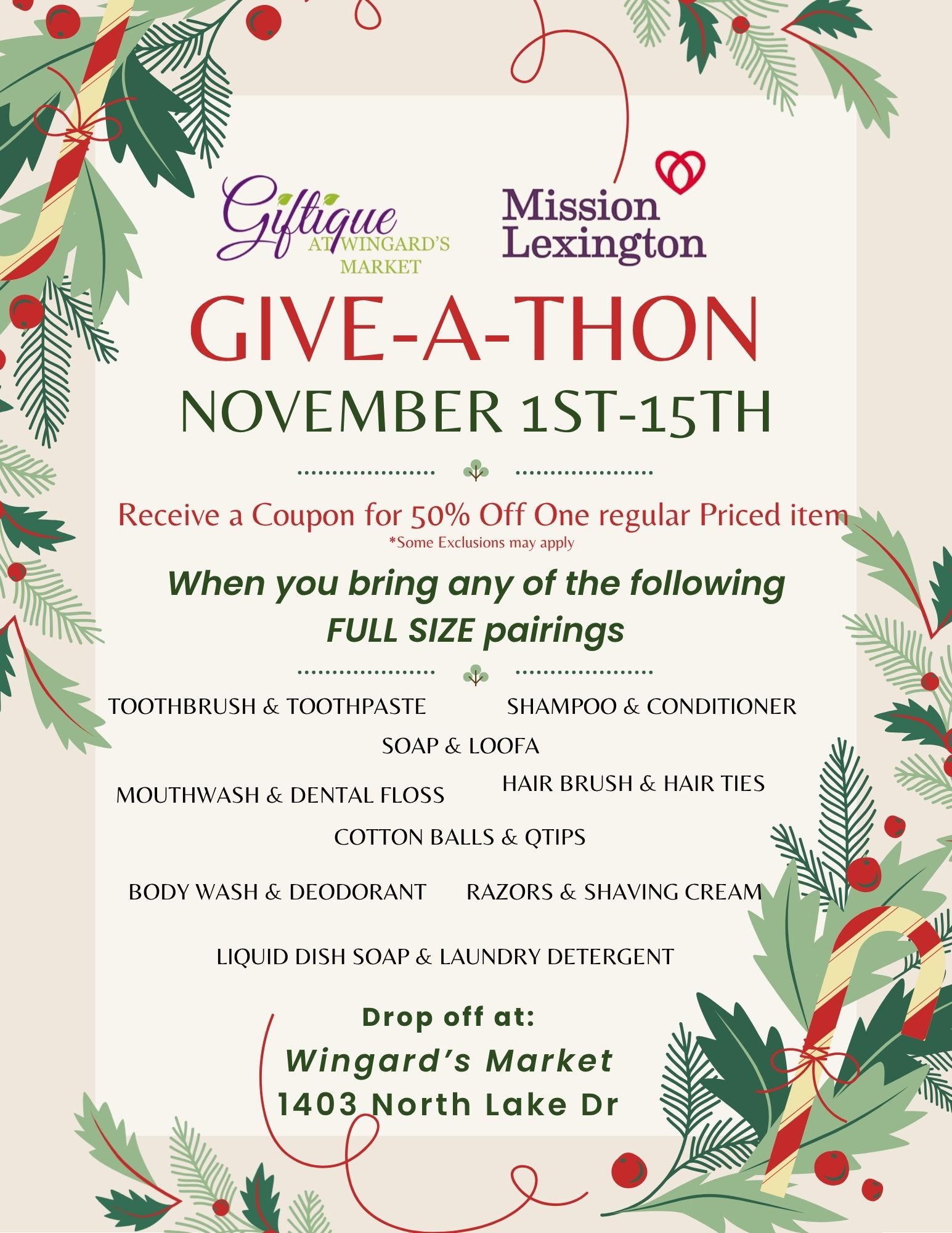 From November 1 – 15, you can participate in the Giftique Give-A-Thon for Mission Lexington! Bring in a pair of the needed items to donate and receive a *50% off one item at Wingard’s! These items include: shampoo and conditioner, a toothbrush and toothpaste, razors and shaving cream and much more! Help give back to the community this season and receive a great discount while you shop!
