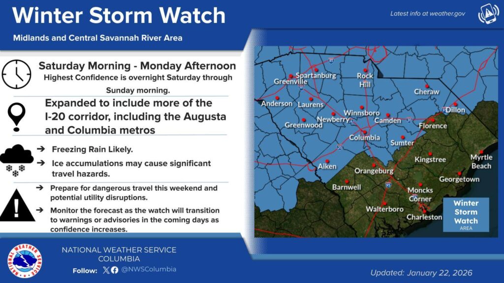 The Winter Storm Watch is in place starting Saturday morning for Lexington County and: Kershaw; Fairfield; Newberry; Saluda; Richland; Lee; Sumter; Calhoun; and Aiken. The Winter Storm Watch will last through Monday afternoon.