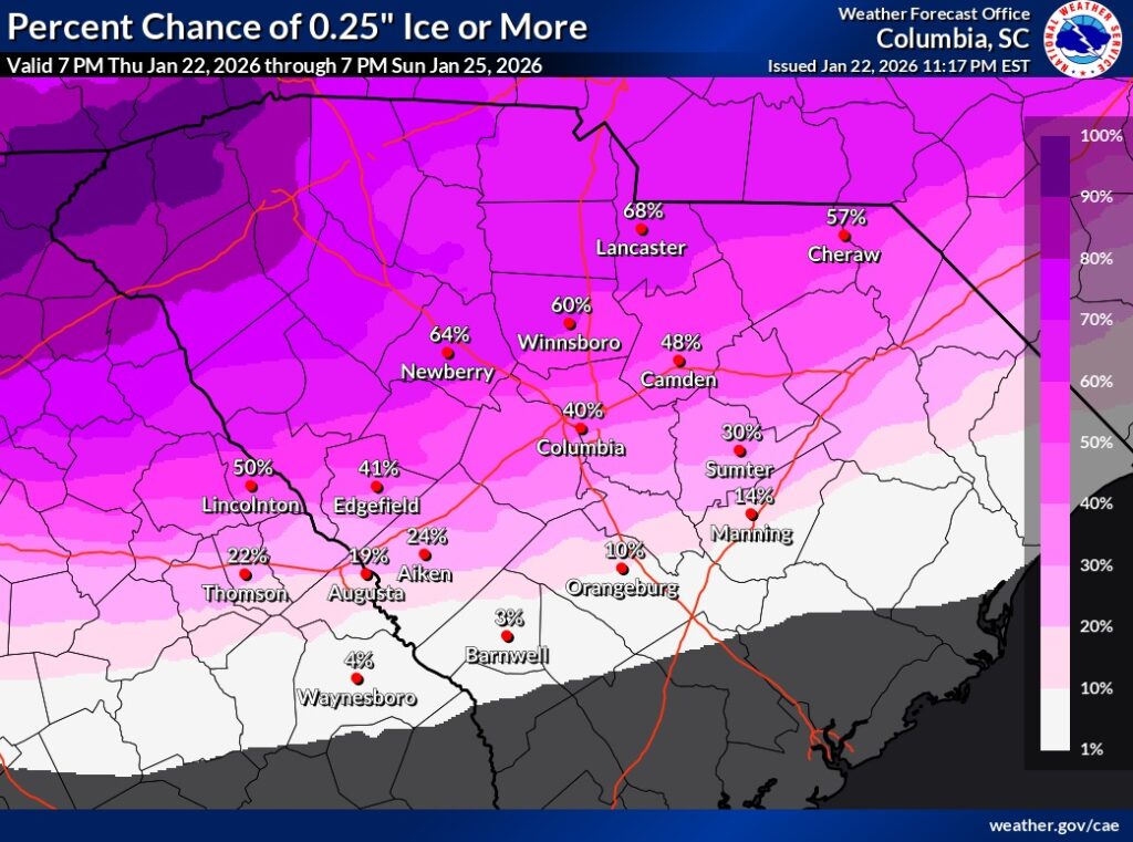 The ice accumulation is expected Saturday night into Sunday morning, according to the National Weather Service, Columbia.
